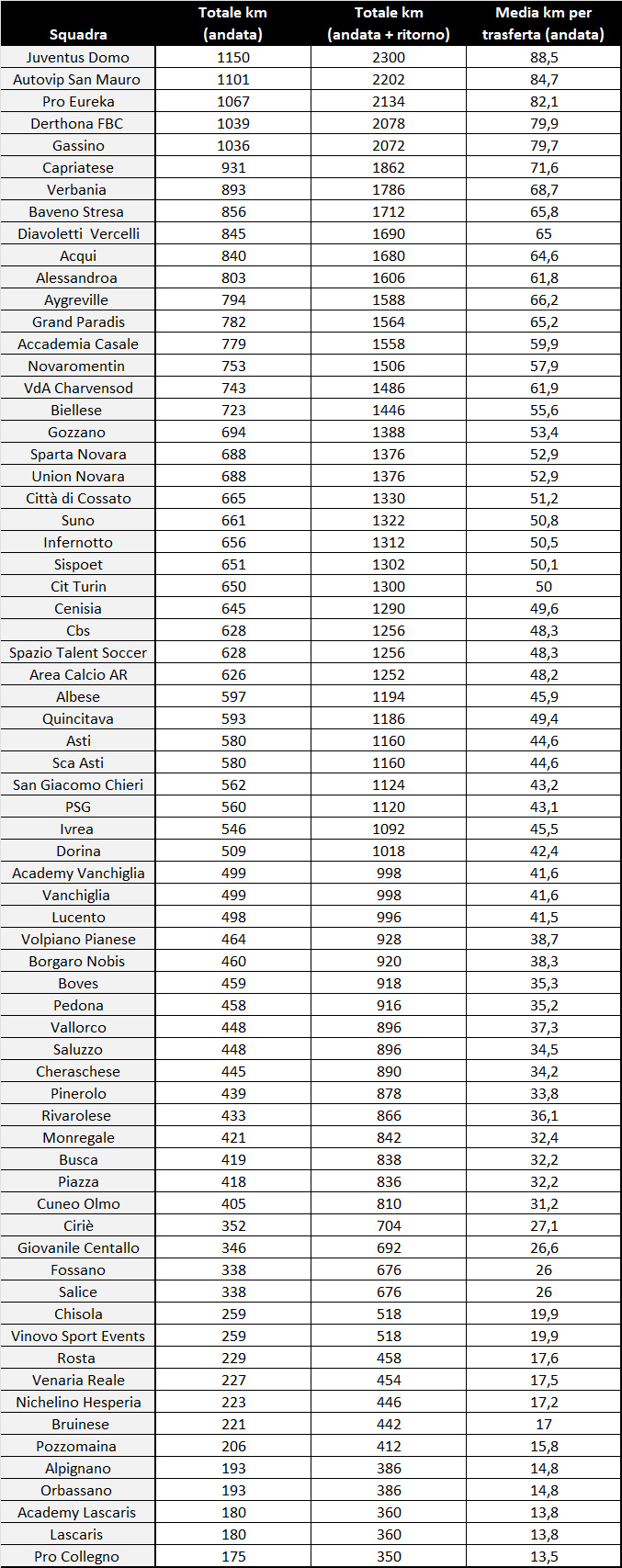In testa alla classifica c’è la Juve Domo, che per giocare nel campionato regionale Under 14 farà circa 2300 chilometri, con una distanza media di 88,5 chilometri per partita (quindi una percorrenza di 177 chilometri tra andata e ritorno). Al quarto posto il Derthona, con 1039 chilometri totali, poco meno di 160 ogni domenica. Se vivi agli “estremi” del Piemonte, ci sta. E infatti si piazzano nelle “zone alte” della classifica delle distanze anche Capriatese, Verbania, Baveno Stresa, Diavoletti Vercelli, Acqui, Alessandria, le novaresi e le valdostane. Ma attenzione, al secondo posto c’è l’Autovip San Mauro (2202 chilometri totali, distanza media 84,7), al terzo la Pro Eureka (2134 chilometri in tutto, 82,1 a botta), al quinto il Gassino (somma di 2036 chilometri, 79,7 in media). Per fare un altro paragone, sono 200 chilometri in più dell’Aygreville, 250 più dello Charvensod.
