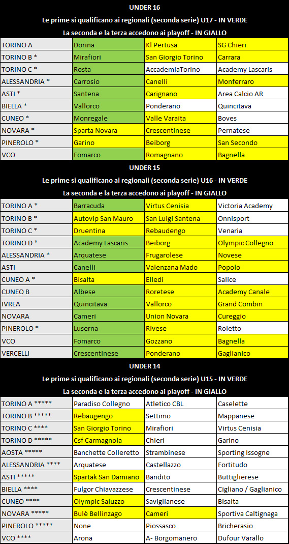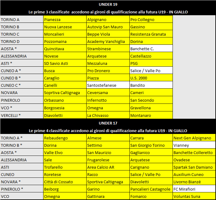 Per quanto riguarda i gironi di qualificazione alla futura U19, hanno conquistato un posto San Giorgio Torino U17; Strambinese U19 e Banchette Colleretto U17 nei gironi di Aosta; Mezzaluna e PSG U19 nell’astigiano; Omegna e Gravellona U19 nel girone di Vco; e ancora il Montanaro U19 a Vercelli. Nei gironi di Cuneo, si laureano campioni Busca, Caraglio e Canelli, mentre accede ai gironi l’U.S. 2000. Emozioni forti nel girone U17 di Pinerolo: Beiborg campione, Pancalieri Castagnole qualificato, l’FC Mirafiori supera il Valle Po al quarto posto.